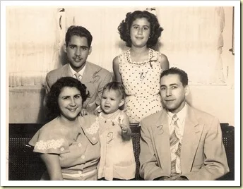 Thelma Grullón de Gómez, junto a su esposo Manuel y sus hijos Jesús Rubén, Lililina y Floria. A la derecha Dolores Messina Fernández de Ramos -Lolita- junto a su esposo Leoncio y sus hijos Wellington y Emmanuel.